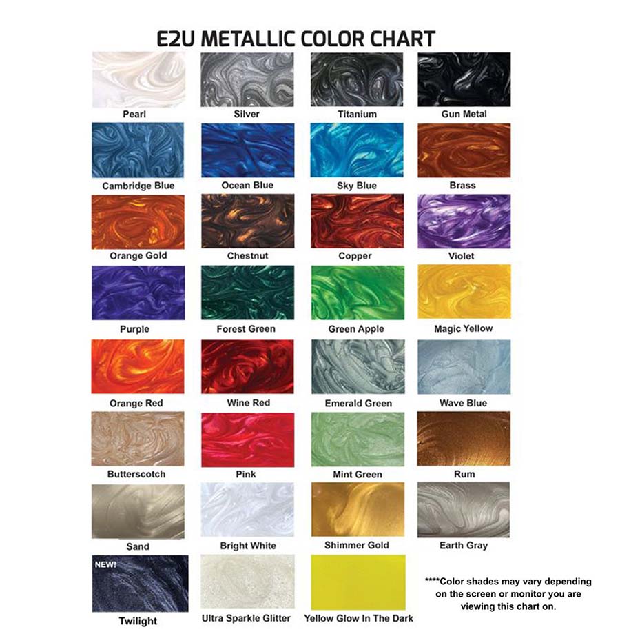 - Application: For optimum color effects, a black base coat is recommended before applying your choice of metallic color. 2oz, 16oz, and 32oz quantities available. If desired, simply add less pigment to achieve a more translucent color. The recommended epoxy to mix our metallic pigments is the E2U Metallic Epoxy. Our metallic pigments are also compatible with many other epoxies, urethanes, and polyaspartics.