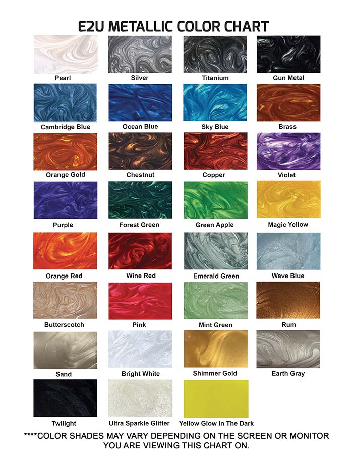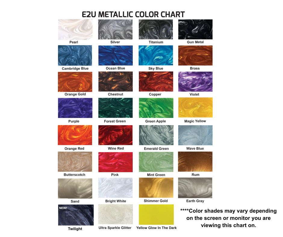 E2U metallic pigments allow you to easily add reflective metallic color to your clear Metallic Epoxy to create beautiful, high gloss, metallic epoxy finishes. E2U Metallic Pigment comes in an array of color choices, enabling the end user to have limitless possibilities when combined with our Metallic Epoxy Resin. Colors can also be mixed to create endless combinations.